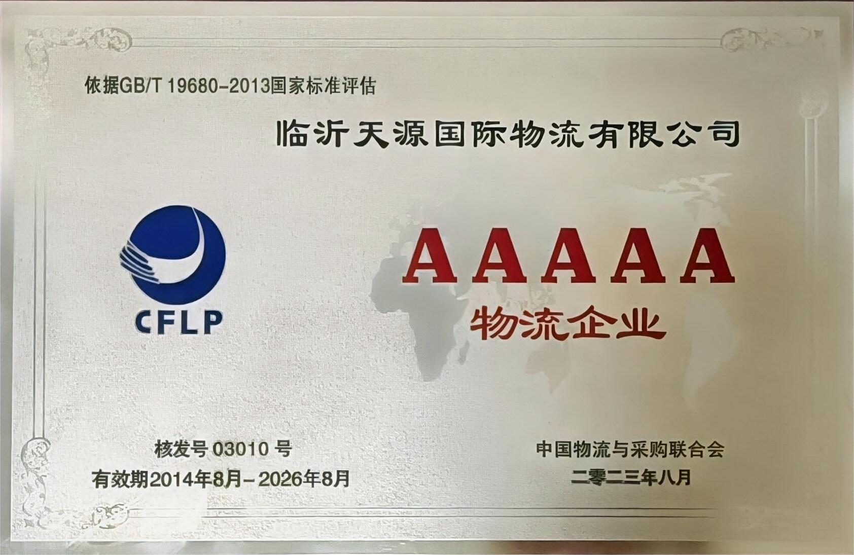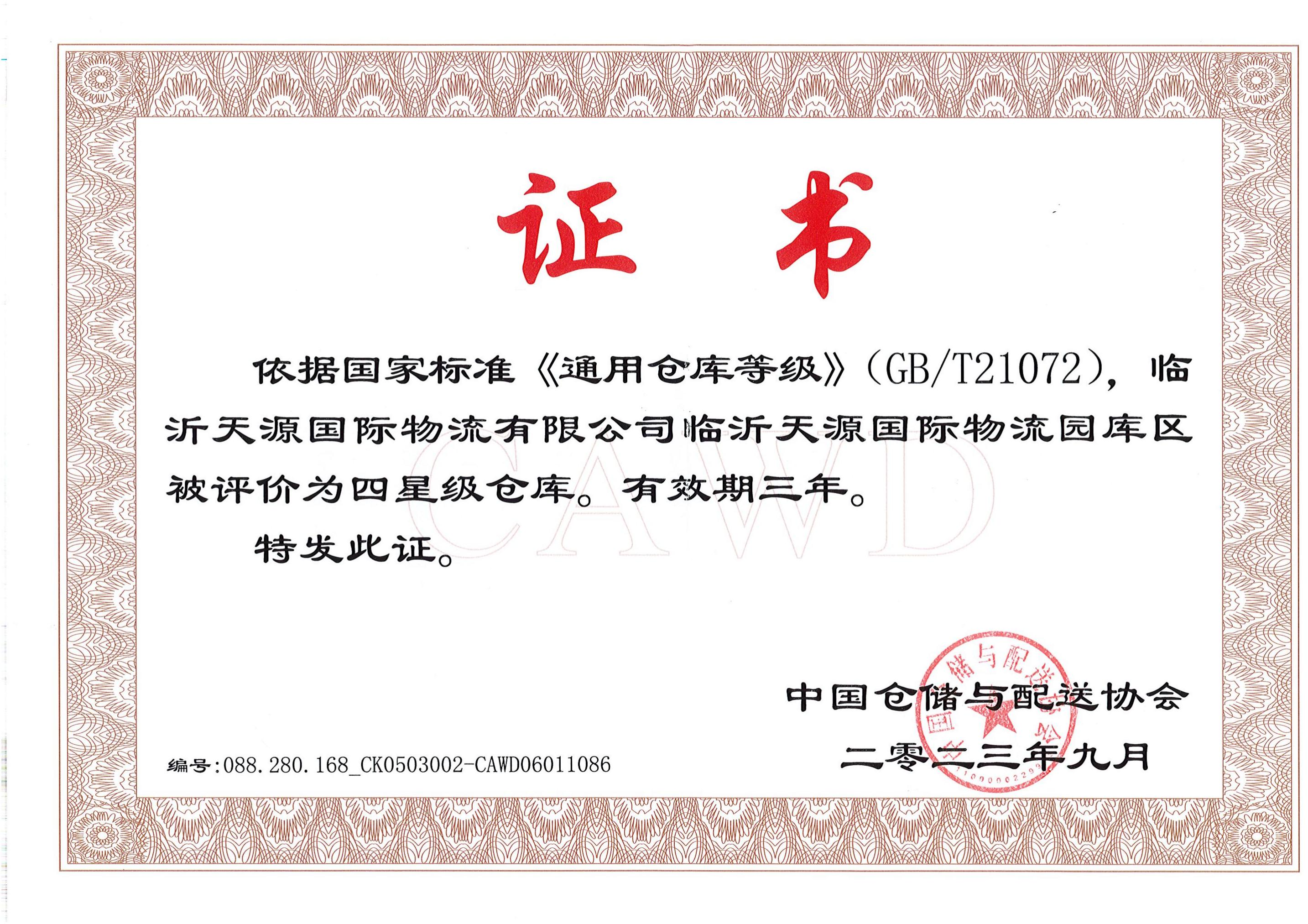九月份,臨沂天源國(guó)際物流有限公司順利通過(guò)中國(guó)倉(cāng)儲(chǔ)與配送協(xié)會(huì)專家組審核、現(xiàn)場(chǎng)查看、評(píng)估,榮獲中國(guó)倉(cāng)儲(chǔ)與配送協(xié)會(huì)“四星級(jí)倉(cāng)儲(chǔ)”榮譽(yù)稱號(hào)。