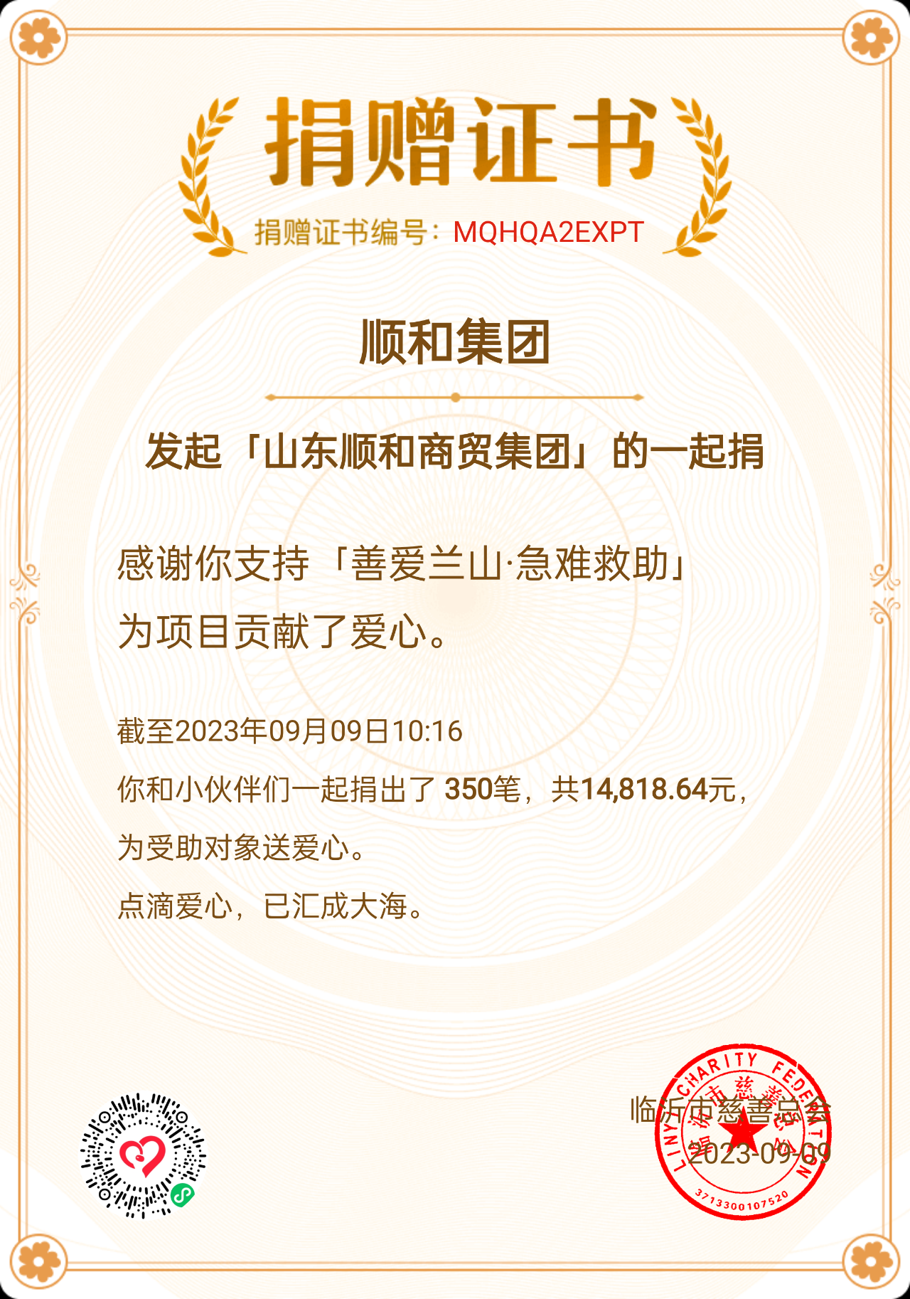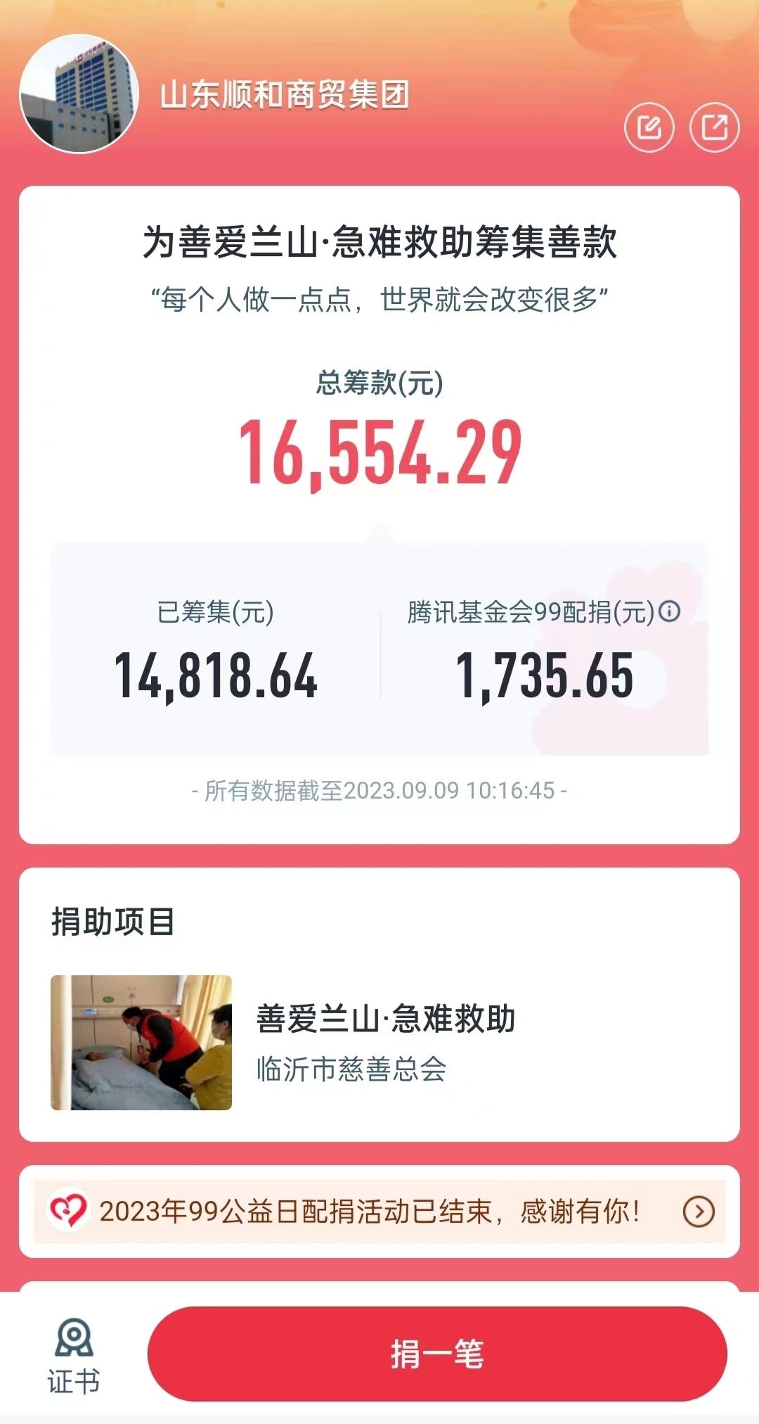 為進一步弘揚慈善精神,傳播慈善理念,營造人人關心慈善事業(yè)、人人參與慈善事業(yè)的良好氛圍,9月7日—9日,山東順和集團開展為期3天的“慈心一日捐”暨“99公益日”活動。 本次活動按照“廣泛發(fā)動、鼓勵奉獻”的原則,通過騰訊網絡募捐方式進行,集團領導班子成員率先垂范,全體干部職工積極踴躍參與、奉獻愛心,截止至9日上午10時,本次“慈心一日捐”活動共籌集善款16547.39元,獲得騰訊基金配捐1728.75元,充分彰顯了順和人的慈善意識和責任擔當,用實際行動傳遞善行,營造了愛心互助、無私奉獻、樂善好施的濃厚氛圍。
