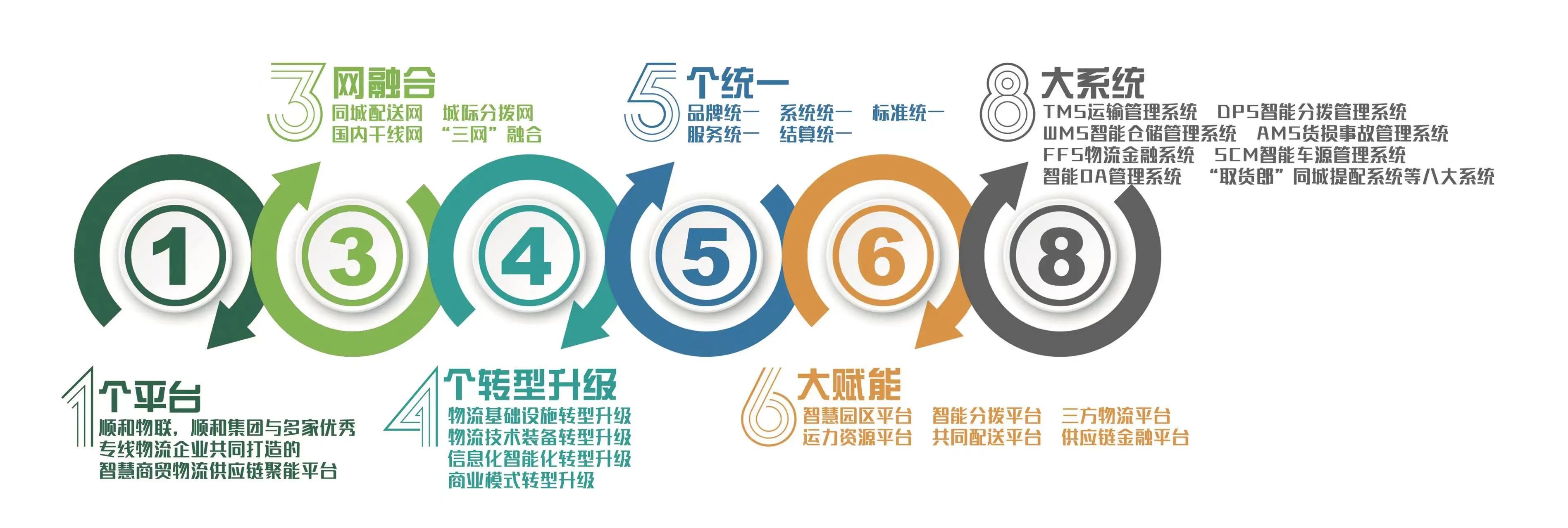 順和國際智慧物流園搭建臨沂首個智慧商貿(mào)物流供應(yīng)鏈聚能創(chuàng)新平臺——順和物聯(lián),按照趙玉璽提出的1個平臺上實現(xiàn)3網(wǎng)融合、4個轉(zhuǎn)型升級、5個統(tǒng)一、6大賦能、8大系統(tǒng)的“1+34568”發(fā)展戰(zhàn)略。即在順和物聯(lián)平臺上,實現(xiàn)同城配送網(wǎng)、城際分撥網(wǎng)、國內(nèi)干線網(wǎng)“三網(wǎng)融合”的物流網(wǎng)絡(luò)體系;推動臨沂物流基礎(chǔ)設(shè)施,物流技術(shù)裝備,物流信息化、智能化,物流商業(yè)模式的四個轉(zhuǎn)型升級;以“品牌統(tǒng)一、系統(tǒng)統(tǒng)一、標準統(tǒng)一、服務(wù)統(tǒng)一、結(jié)算統(tǒng)一”五個統(tǒng)一為抓手;通過打造六大賦能平臺;配套八大智慧系統(tǒng),達到產(chǎn)業(yè)共享化、樞紐智慧化,實現(xiàn)“點收全國、點發(fā)全國”。